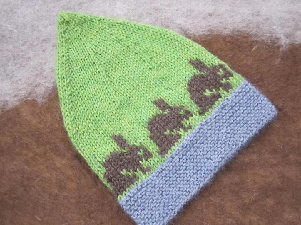 12 M auf 2 Nadeln verteilt anschl. und zur Runde schließen und 8 Rd in Farbe 2 stricken, danach die 1. u. 2., 5. u. 6., 7. u. 8. und 10. u. 12 M zusammenstricken, 2 Rd. ohne Abnahme, in der folgenden Rd immer 2 M zusammenstrocken, die restl. 4 M zusammenziehen.